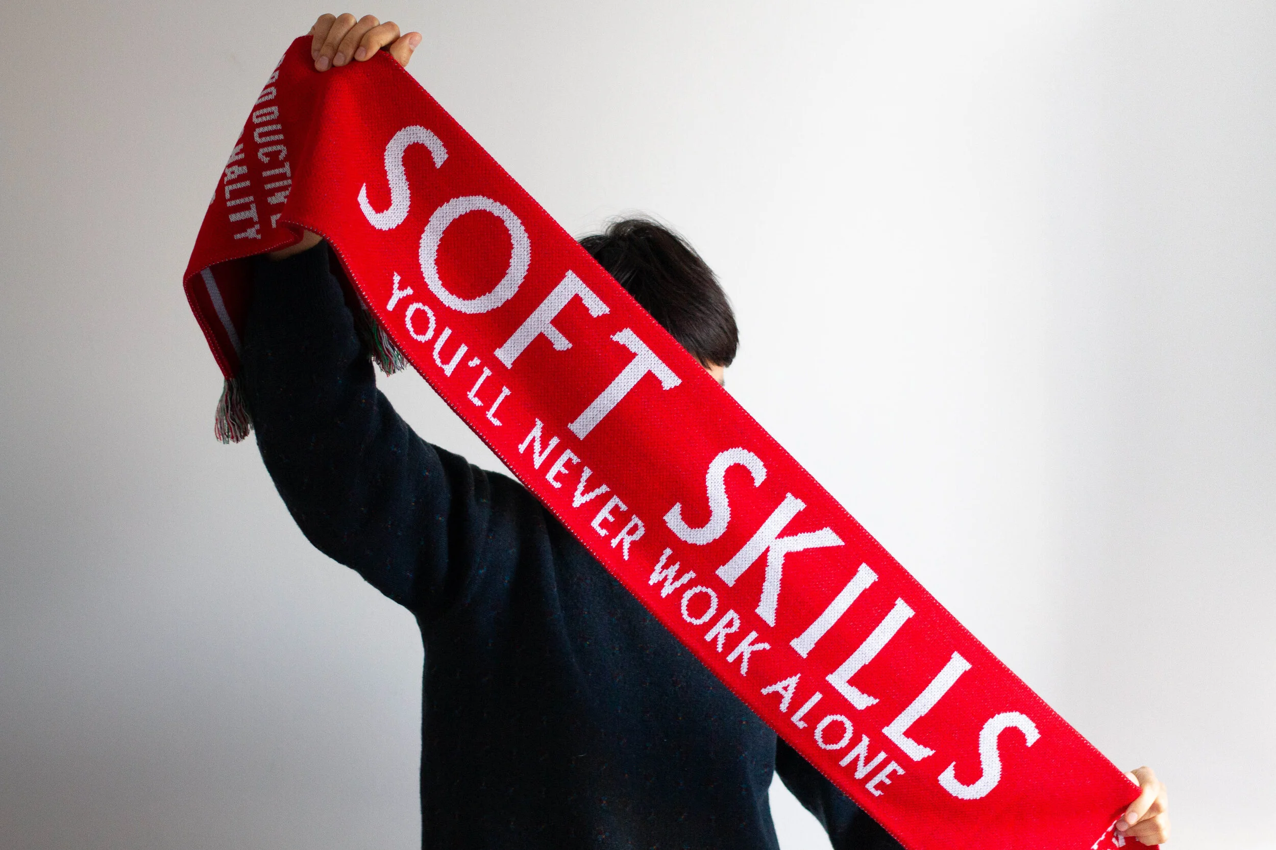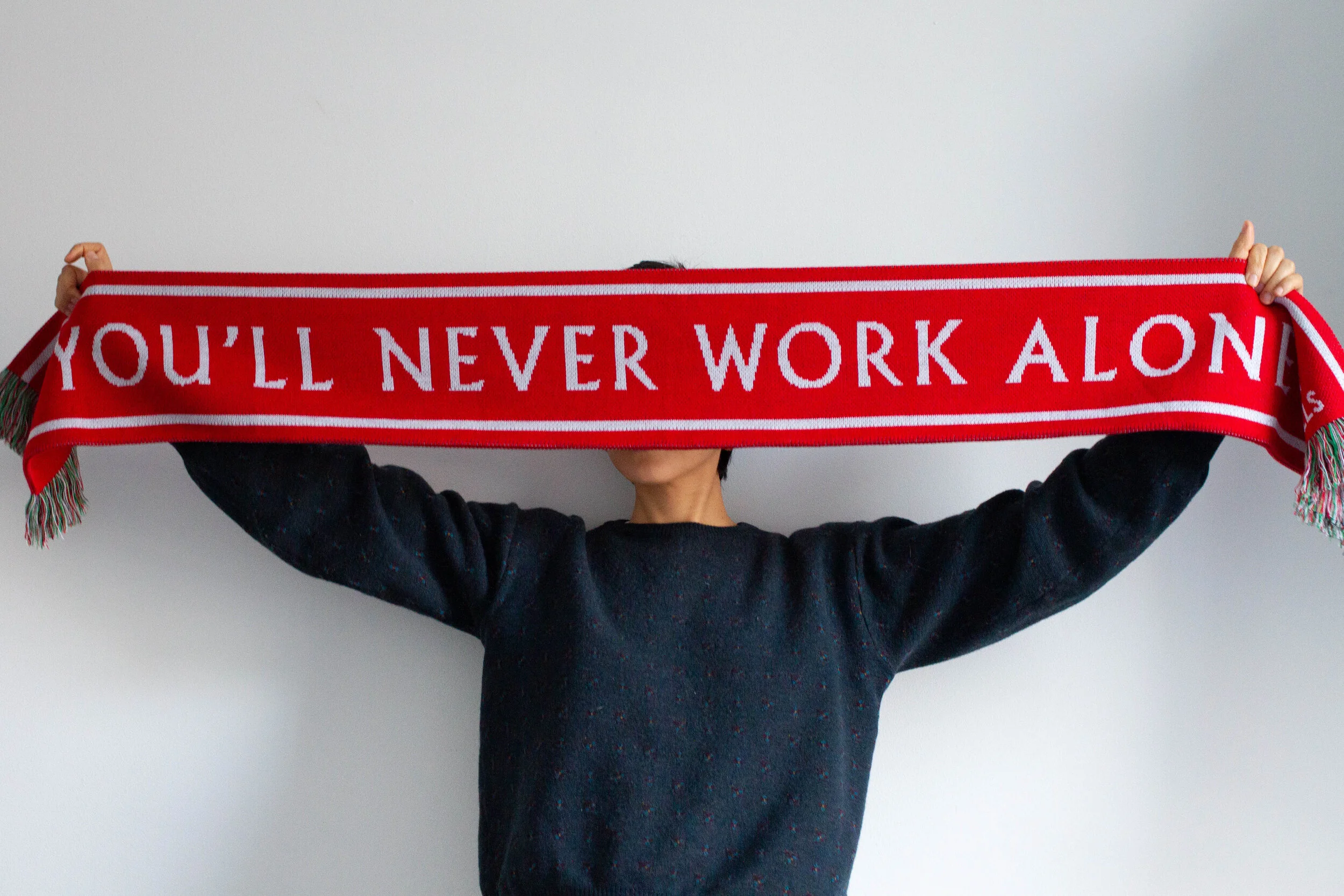 Work Scarves are a series of fan scarves inspired by the terminology of the employability sector. During my research residency with the career service of the University of Liverpool I became fascinated with the language and syntax that career advisors and the employment industry uses to support and encourage students and recent graduates in their process of transitioning from education to the world of work. The enthusiastic tone of the corporate jargon and productivity-driven language reminded me of the chanting of football fans. Where the chanting of words of strength, identity and pride have become abstract sounds of the idea of success and winning against the competition. ‘Soft skills’, ‘opportunities’, ‘commercial awareness’, ‘real world scenarios’!